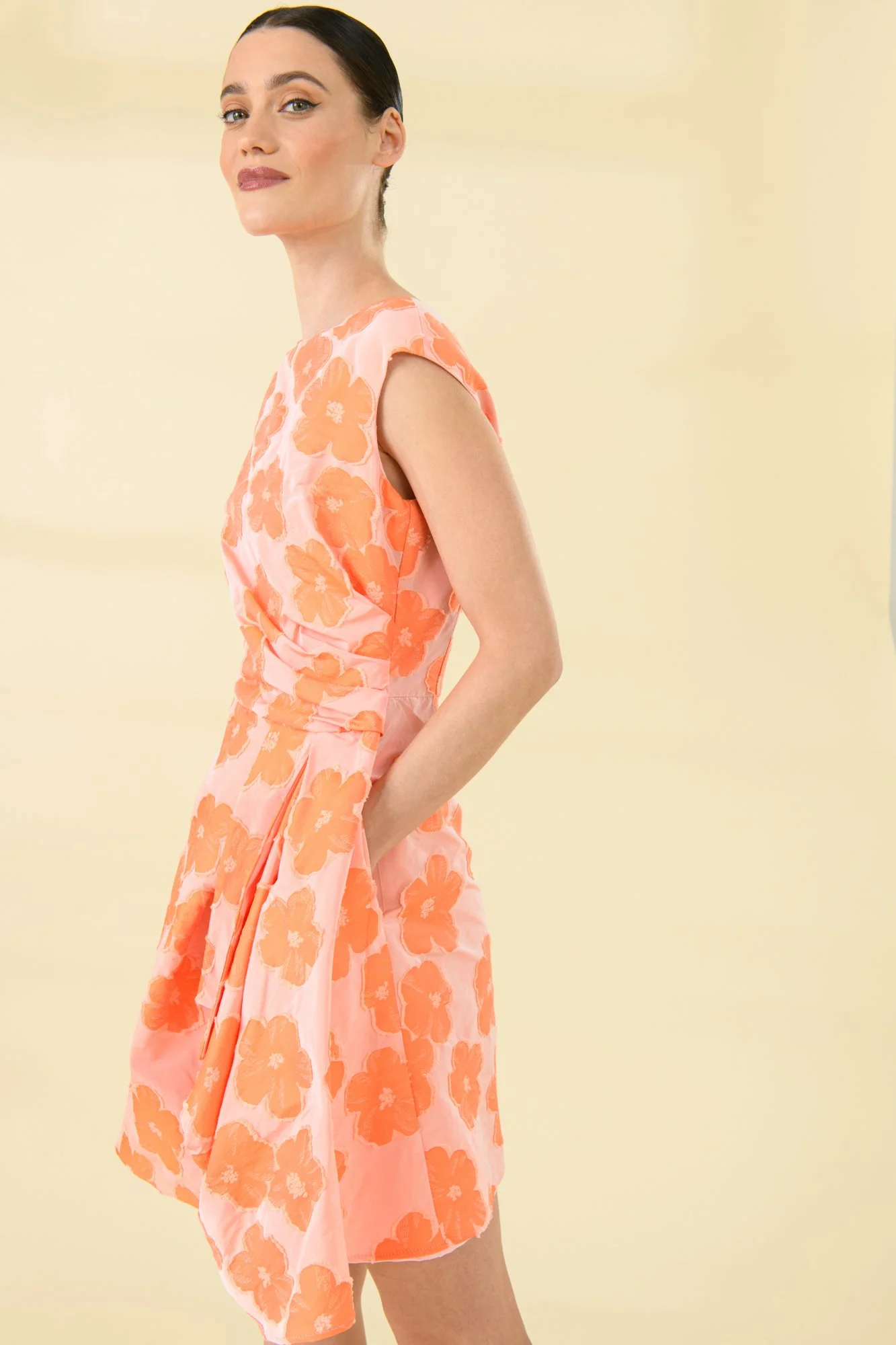 Anna Dress Orange, in embroidered taffeta flower. Gathered sleeve head, bodice style line details, A line skirt with side pockets
